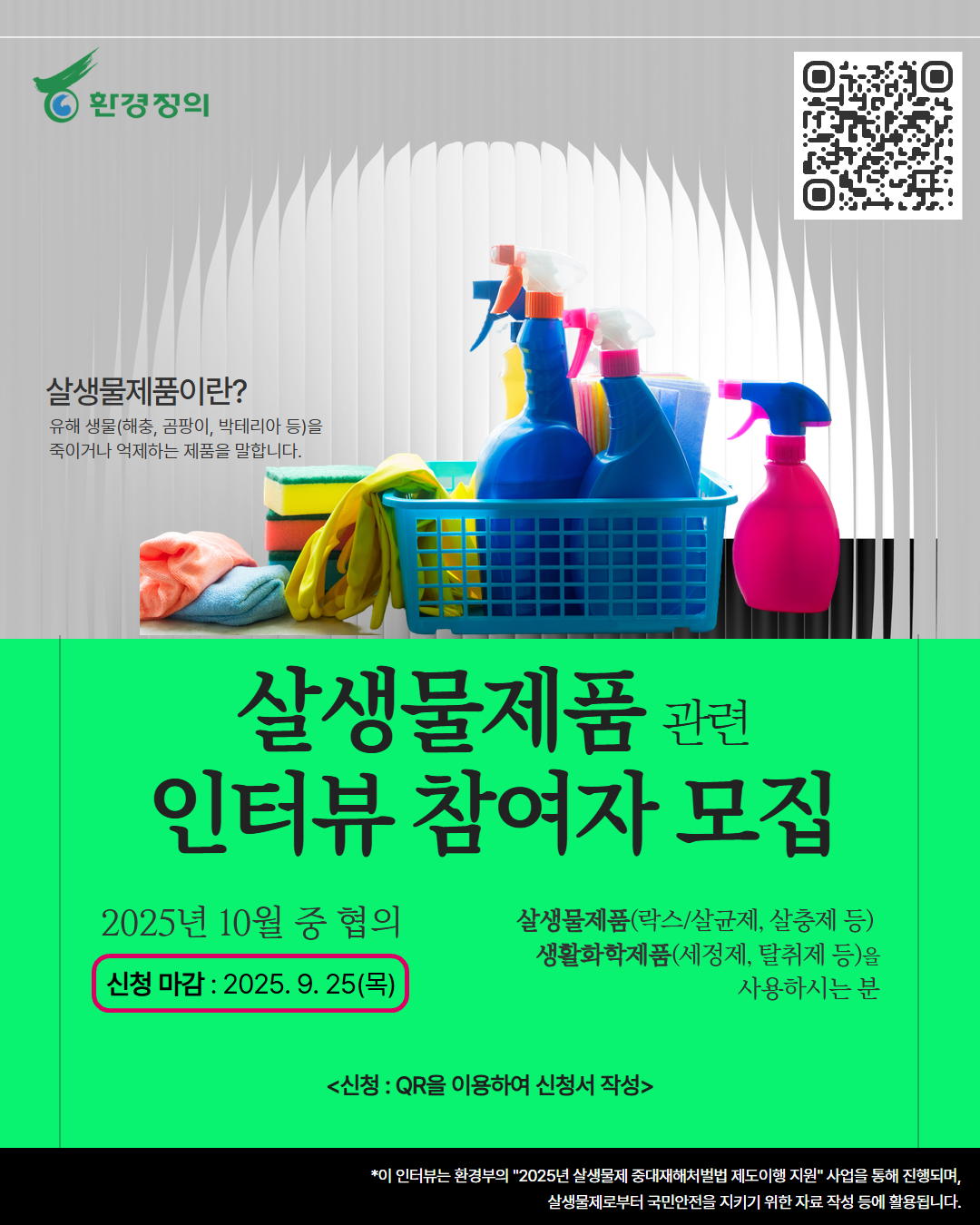 환경정의는 환경부와 함께 살생물제의 위험 정보를 제공하고 안전사용 방법에 대해 홍보해 왔습니다. 지난 3년간(2022년~2024년) 제작된 안전 사용을 비롯한 위험 정보가 담긴 홍보물을 제작하였고, 그 홍보물에 대한 인식과 이해를 확인하고자 포커스 그룹 인터뷰(FGI)를 진행합니다.