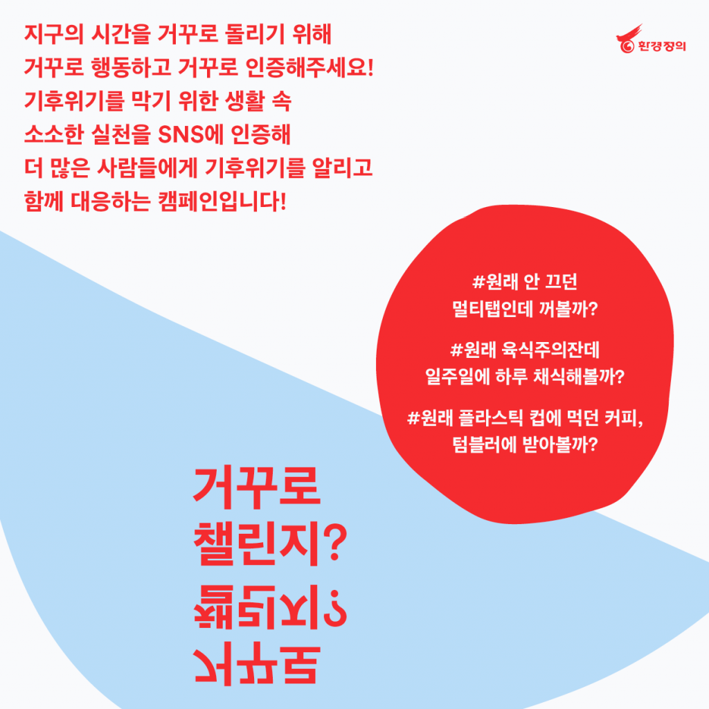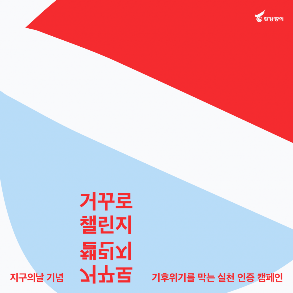 환경정의는 시민이 일상에서 지구를 지키기 위한, 기후위기를 극복하기 위한 일상의 힘을 기르는 것이 중요하기에 환경의 날이 있는 6월까지 지구의 시간을 거꾸로 돌리는 기후행동 ‘거꾸로챌린지’를 제안합니다.