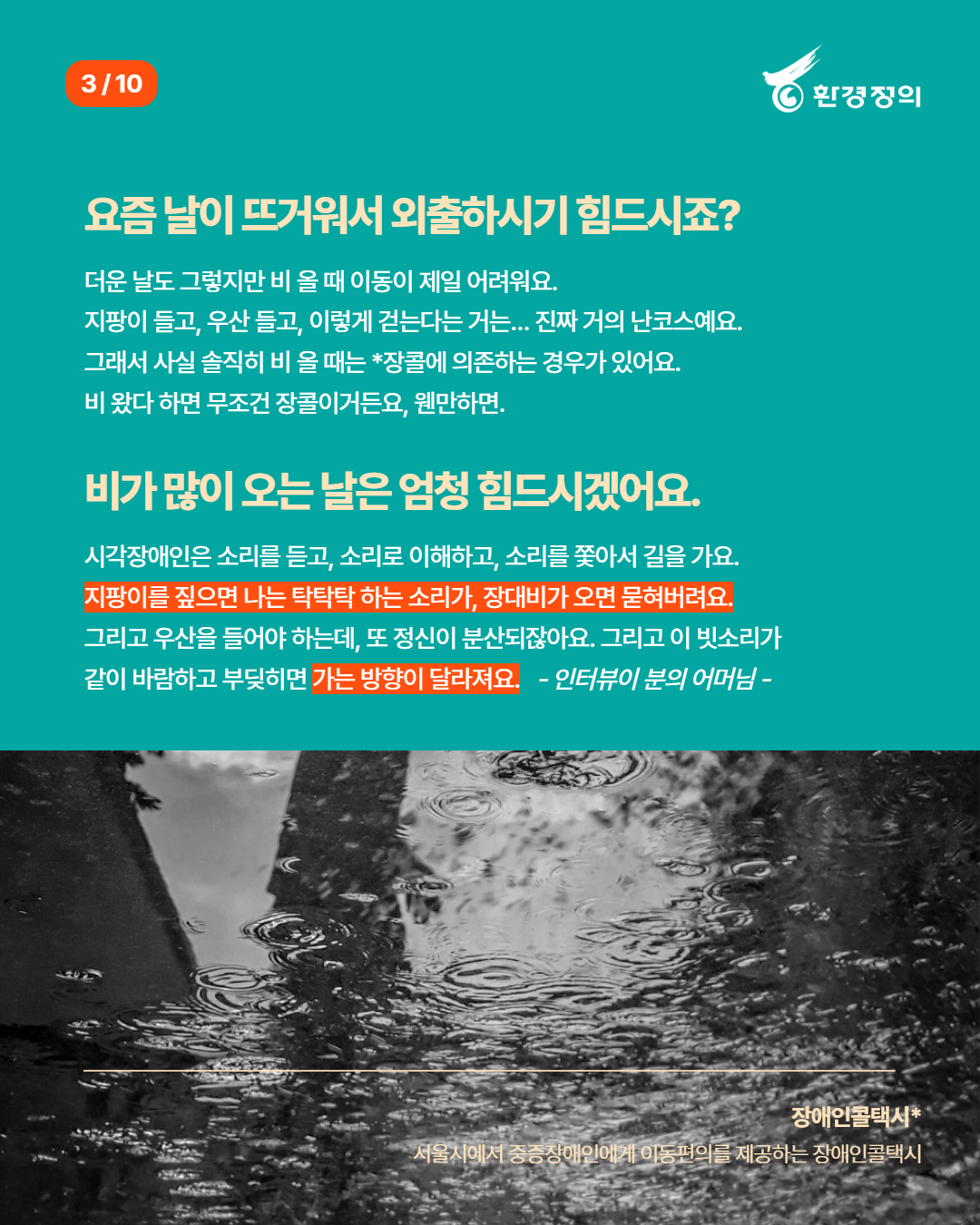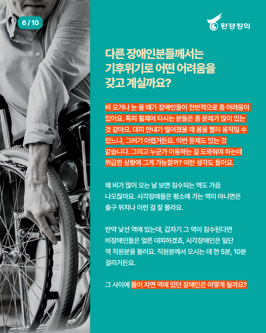 그래서 환경정의는 기후위험이 큰 이들의 목소리를 통해 당사자의 현실을 알리고, 기후위기로부터 안전한 사회 촉구와 그 촉구의 당위, 필요성을 사회에 전하고자 합니다.