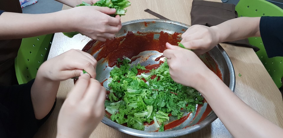 두리하나국제학교 친구들은 보통의 청소년들과 입맛이 달랐습니다. 얼큰하고 맵고 짠 음식을 유난히 선호하였습니다. 다시마 롤을 만들기 위해 준비한 숙주, 오이채, 당근채를 일부 덜어 가져다 매운 고춧가루, 식초, 설탕을 듬뿍 넣어 새로운 요리를 만들고는 엄청 맛나게 먹으며 좋아했습니다. 아이들이 ‘선생님도 잡숴보세요’ 하는 말에 한 젓가락 입에 넣어 먹어 보니 엄청 맵고 시고 짜고 달달한 자극적인 음식이었습니다. ‘이런 건 어디서 먹던 거야? 중국에서? 네’ 고개를 끄덕입니다.