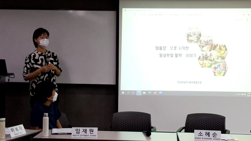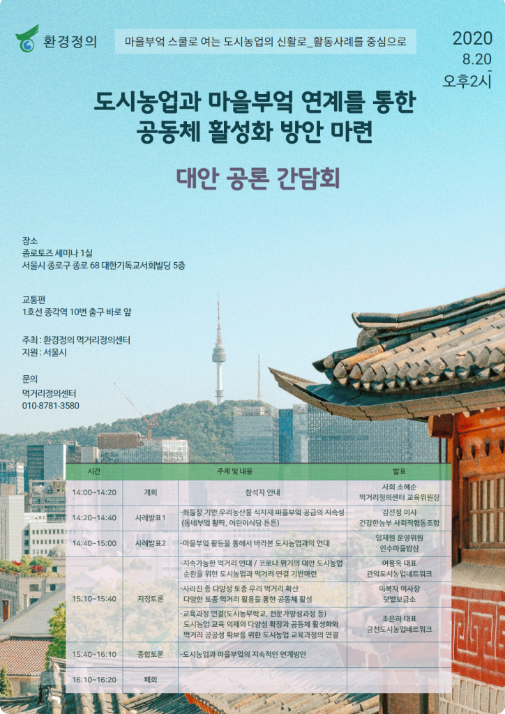 지난 8월 20일, 지속 가능하고 정의로운 먹거리체계 수립을 위해 시민들의 행동을 모으는 운동을 펼쳐나가는 ‘환경정의 먹거리정의센터’의 주최로, 종로에 위치한 토즈 세미나실에서 ‘도시농업과 마을부엌 연계를 통한 공동체 활성화 방안 마련 대안 공론 간담회’가 열렸다.
