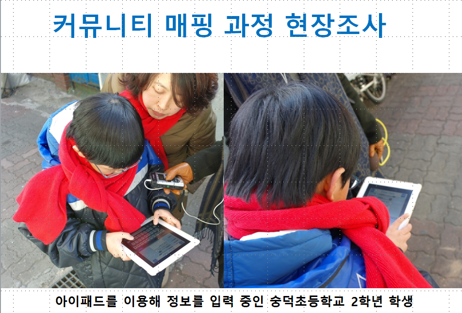 ‘커뮤니티맵핑’은 커뮤니티 구성원들이 함께 사회문화나 지역의 이슈와 같은 특정 주제에 대한 정보를 현장에서 수집하고 이를 지도로 만들어 공유하고 이용하는 과정입니다. 다시 말하면 핵심은 ‘함께’ 정보를 모으고, ‘함께’지도를 그리는 것이죠.