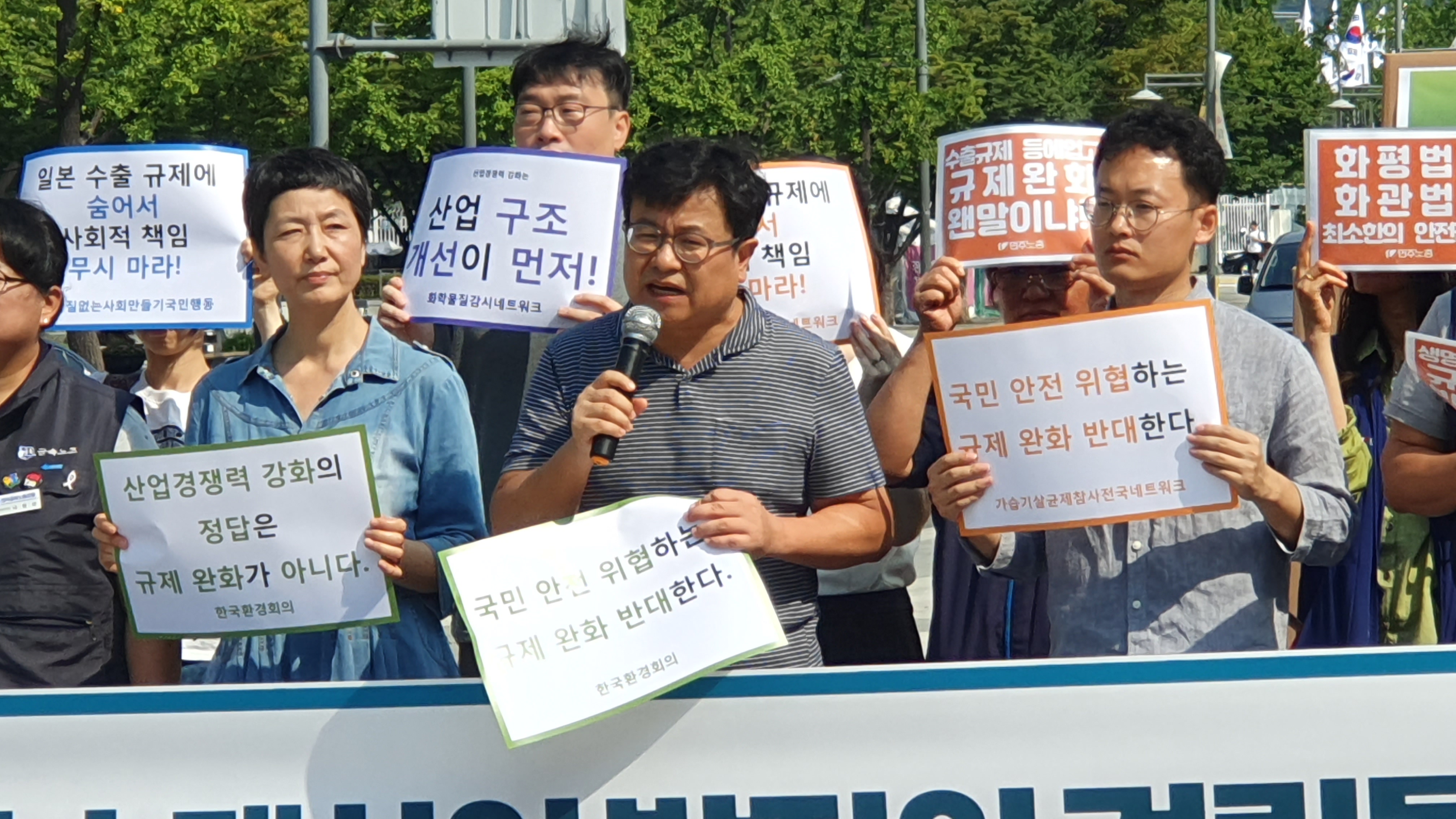 일본 수출 규제 사태의 불똥이 국민의 생명과 안전에 기본이 되는 법률의 규제 완화까지 이어지고 있습니다. 정부가 수출 규제에 대한 대책으로 환경·산업안전보건 관련 인허가 기간 단축 등의 대안을 발표한 상황에서 기업과 경제단체들은 이것만으로는 부족하다며, 화학물질 관련법이나 산업안전보건법상 규제 자제를 대폭 완화하는 법률 개정마저 요구하고 있기 때문입니다. 이에 8월 20일(화) 오전 9시 30분 광화문 광장에서 환경정의, 환경운동연합의, 가습기살균제참사전국네트워크, 발암물질없는사회만들기국민행동, 전국민주노동조합총연맹, 한국환경회의, 화학물질감시네트워크가 소재산업의 경쟁력 강화의 해답을 규제완화에 두어서는 안 된다는 취지의 기자회견을 진행했습니다.
