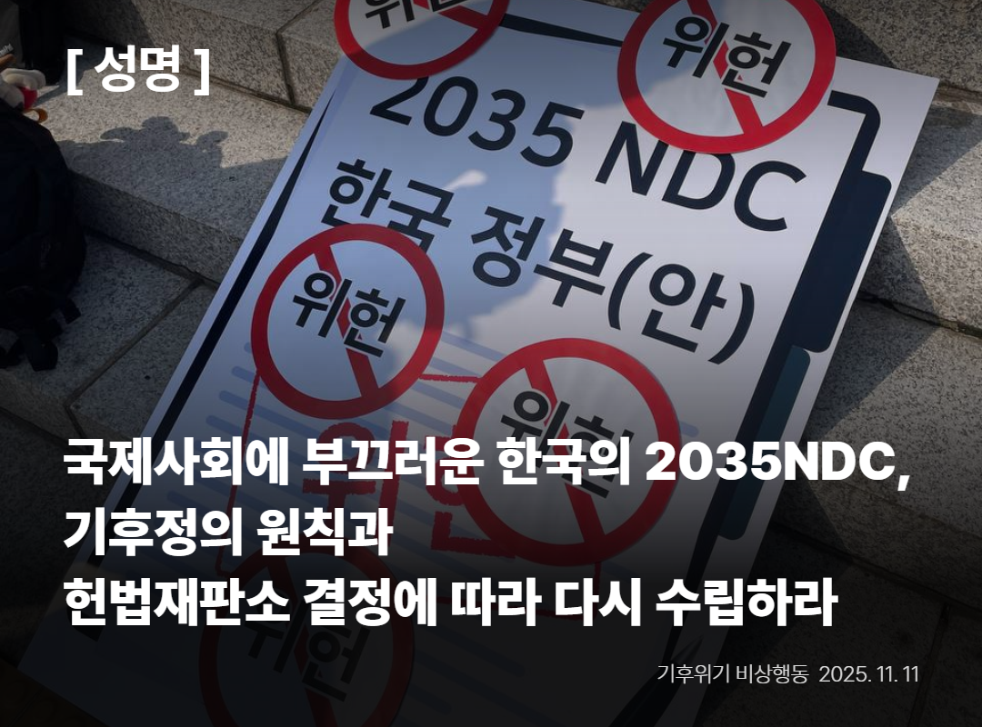 11월11일, 국무회의를 통해 2035국가온실가스감축목표(NDC)가 2018년 대비 53~61%감축으로 확정되었다. 기후위기비상행동은 이번 NDC가 헌법재판소의 결정에 배치되는 위헌적인 것으로서, 시민의 안전한 삶을 담보할 수 없는 목표라는 점을 밝힌다.이재명 정부가 국제사회에 내놓는 첫번째 기후정책이 국제적 기준과 기후헌법소원 결정에 배치된다는 점이 매우 실망스럽다. 이번 국무회의 결정이 끝이 아니라 국회가 입법과정을 통해서 잘못된 목표를 바로잡아 시민의 권리를 지킬 국가의 책무를 다할 것을 촉구한다.