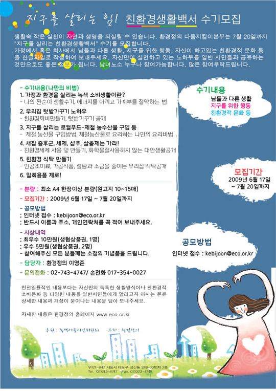 생활속 작은 실천이 자연과 생명을 되살릴 수 있습니다. 환경정의 다음지킴이본부는 7월20일까지 지구를 살리는 친환경생활백서” 수기를 모집합니다.가정에서 혹은 회사에서 남들과 다른 생활, 지구를 위한 행동, 자신이 하고있는 친환경적 문화 등을 한글파일로 작성하여 보내주세요. 자신만이 실천하고 있는 노하우를 일반 시민들과 공유하는 것만으로도 좋은 정보가 됩니다. 남녀노소 누구나 참여가능합니다. 많은 참여부탁드립니다.
