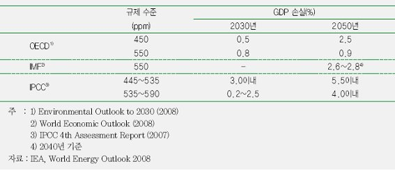 OECD, IMF, IPCC 등의 국제기구에서도 기후변화로 인한 최악의 상황을 방지하기 위해서소요되는 비용을 추정하였다. OECD는 가장 바람직한 대책인 대기중 온실가스 농도를 450ppm으로 안정화시키기 위해 조치를 취할 2030년에는 전세계 GDP의 0.5% 정도의 비용이 들 것으로 추산하고 있다. ‘30년에는 현재 경제규모가 지금보다 2배 이상 커질 것을 감안하면 1조2천억달러에 달한다.