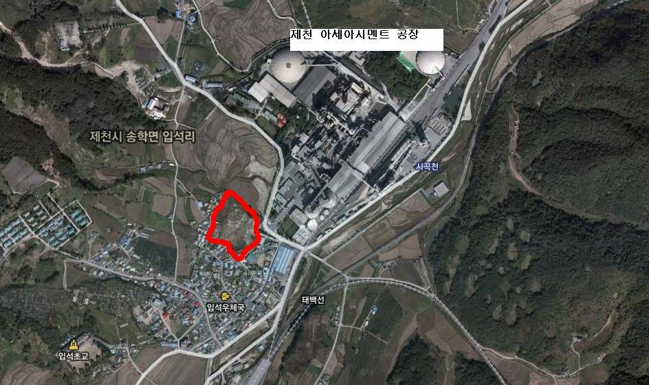 사진 위에 흰바탕의 텍스트 상자로 뭘 써놓은것이 ‘제천 아세아 시멘트 공장’ 이다.